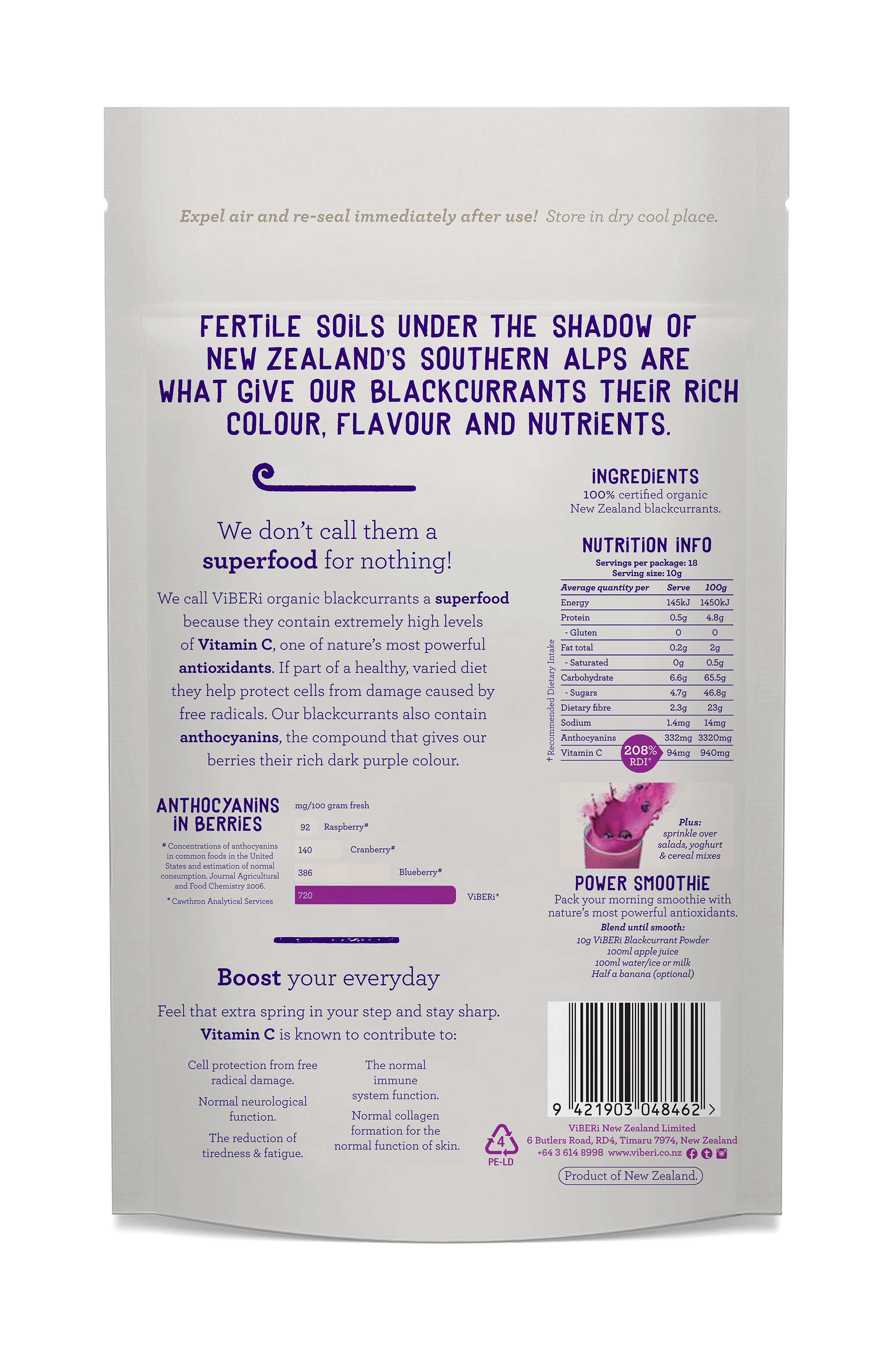 Our ViBERi Blackcurrant Powder is 100% Organic and contains only the pure goodness of New Zealand Blackcurrants.