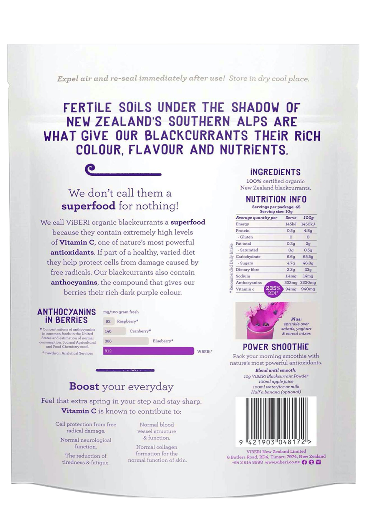 Our ViBERi Blackcurrant Powder is 100% Organic and contains only the pure goodness of New Zealand Blackcurrants.